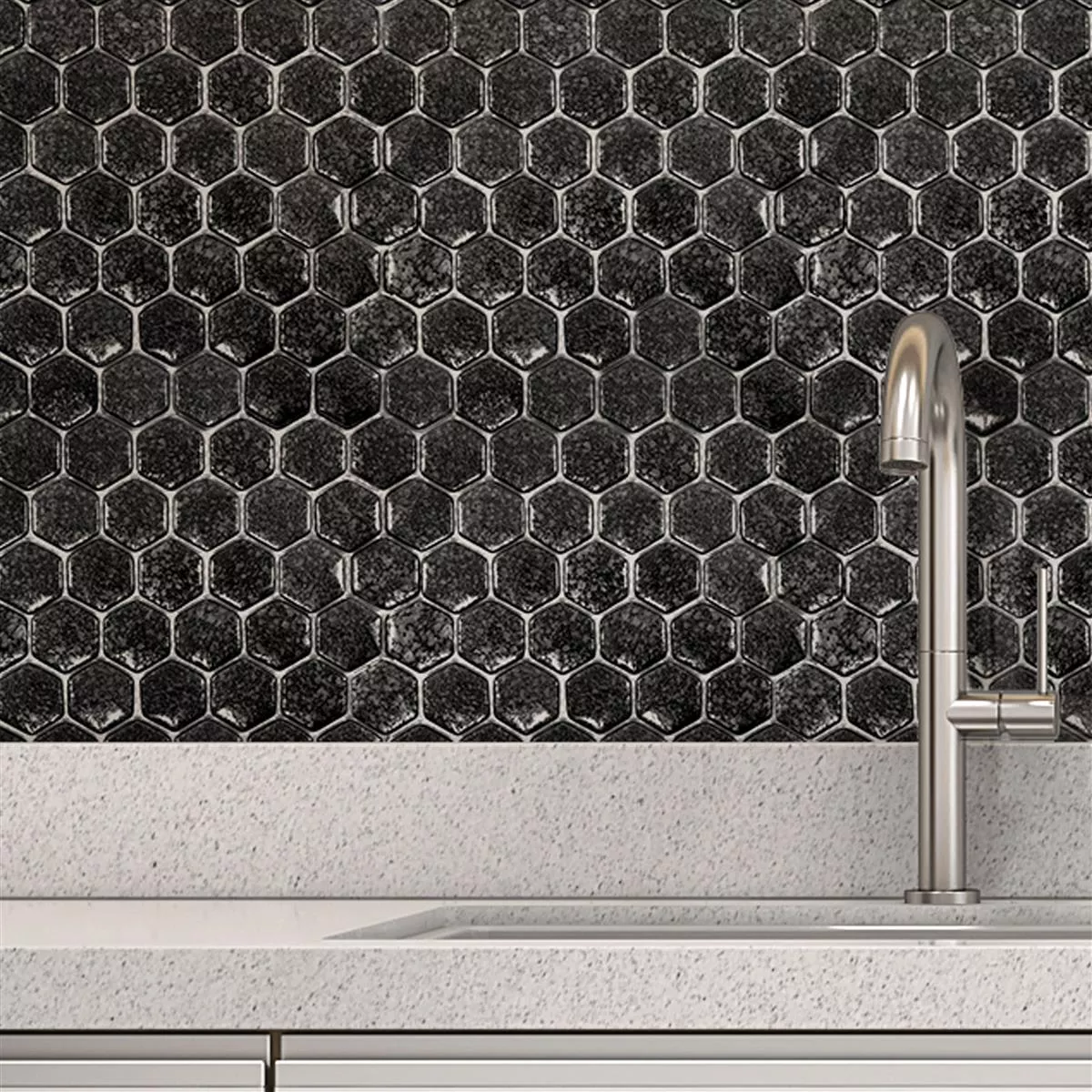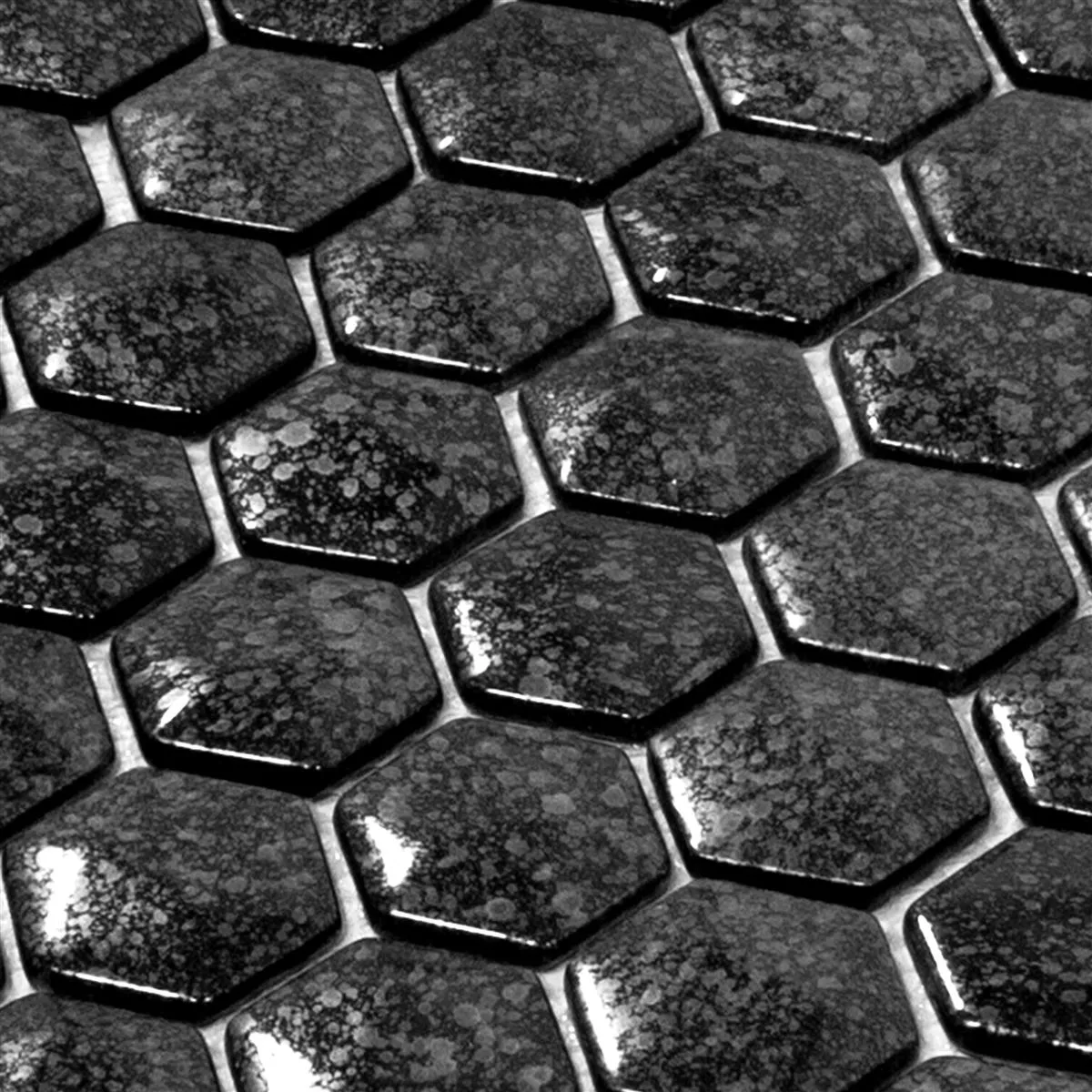Мозаечните плочки се предлагат в практичен шестоъгълен формат 29 х 29 см. Всяка плочка е с размери 40 x 40 mm и дебелина 7,5 mm, създавайки поразителен, но хармоничен външен вид. Гланцовата повърхност улавя светлината и подсилва елегантния сив тон, който може да бъде интегриран в различни интериорни дизайни по различни начини.