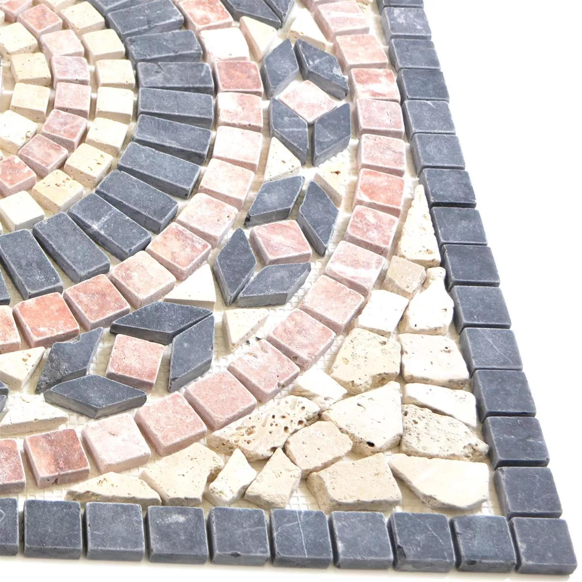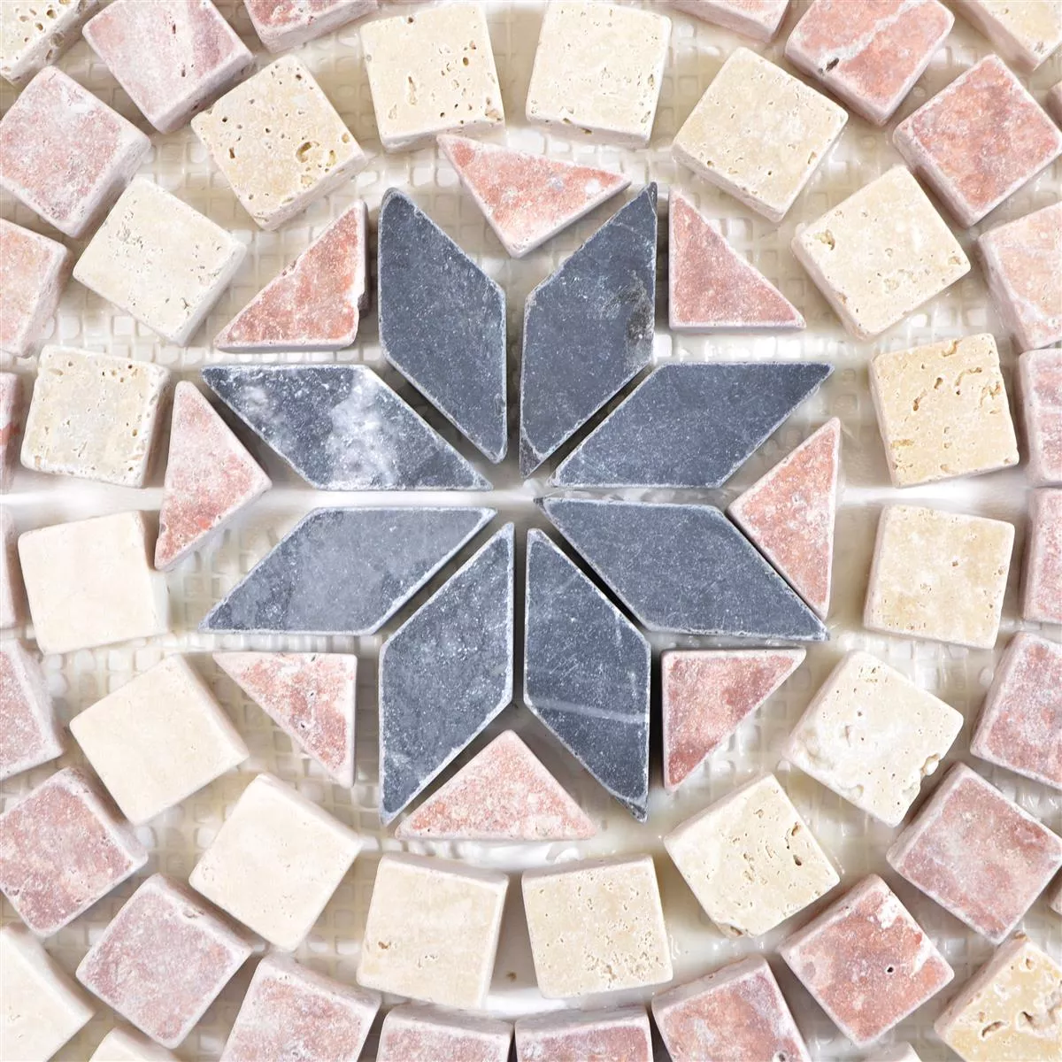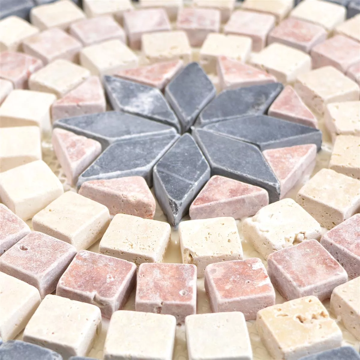Изработената с вкус мозайка Rosone Buxton е изработена от естествен камък травертин и впечатлява с елегантна цветова комбинация от бежово, черно и розово, както и с интересна, кръгла шарка. Матовата повърхност придава на плочката античен вид, което придава на жилищната атмосфера изключителна нотка. Плочката не се хлъзга и е устойчива на замръзване, така че може да се използва и на терасата.