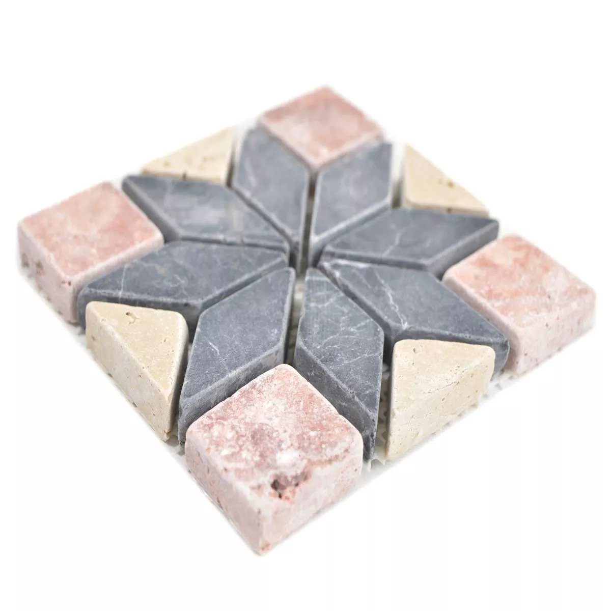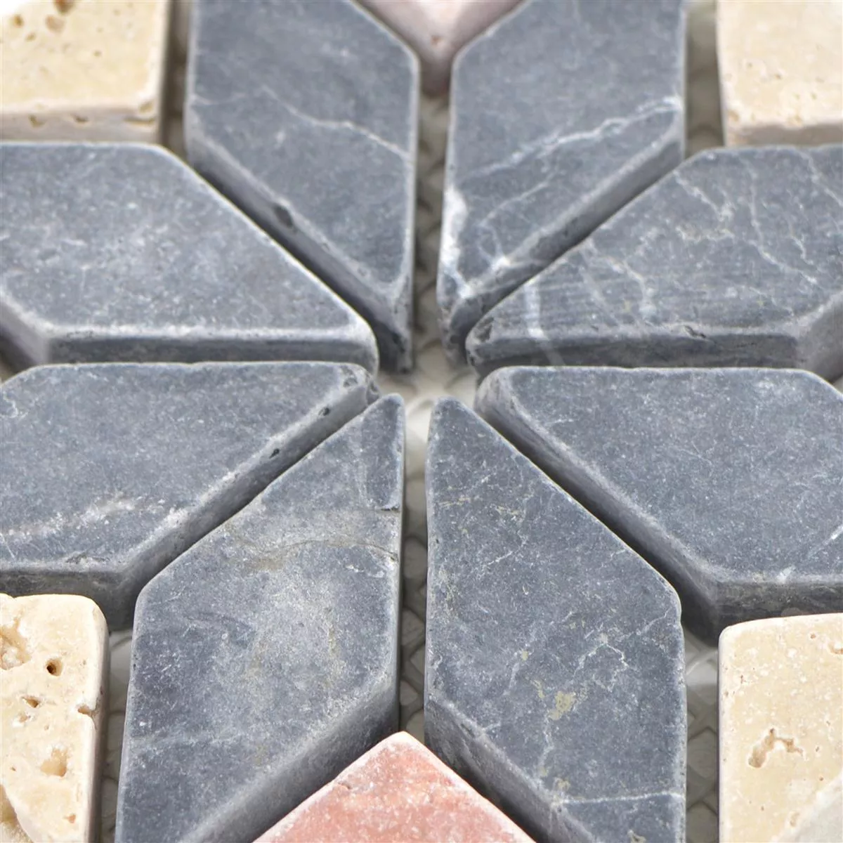 Естественият камък Rosone Gramling впечатлява със своята впечатляваща шарка, уникална структура и избор на цветове. Цветовете червено, черно и бежово на плочките хармонират помежду си и могат да се комбинират по различни начини. Тази плочка от естествен камък се състои от няколко уникални мозаечни плочки. Между отделните мозаечни плочки има канали.
