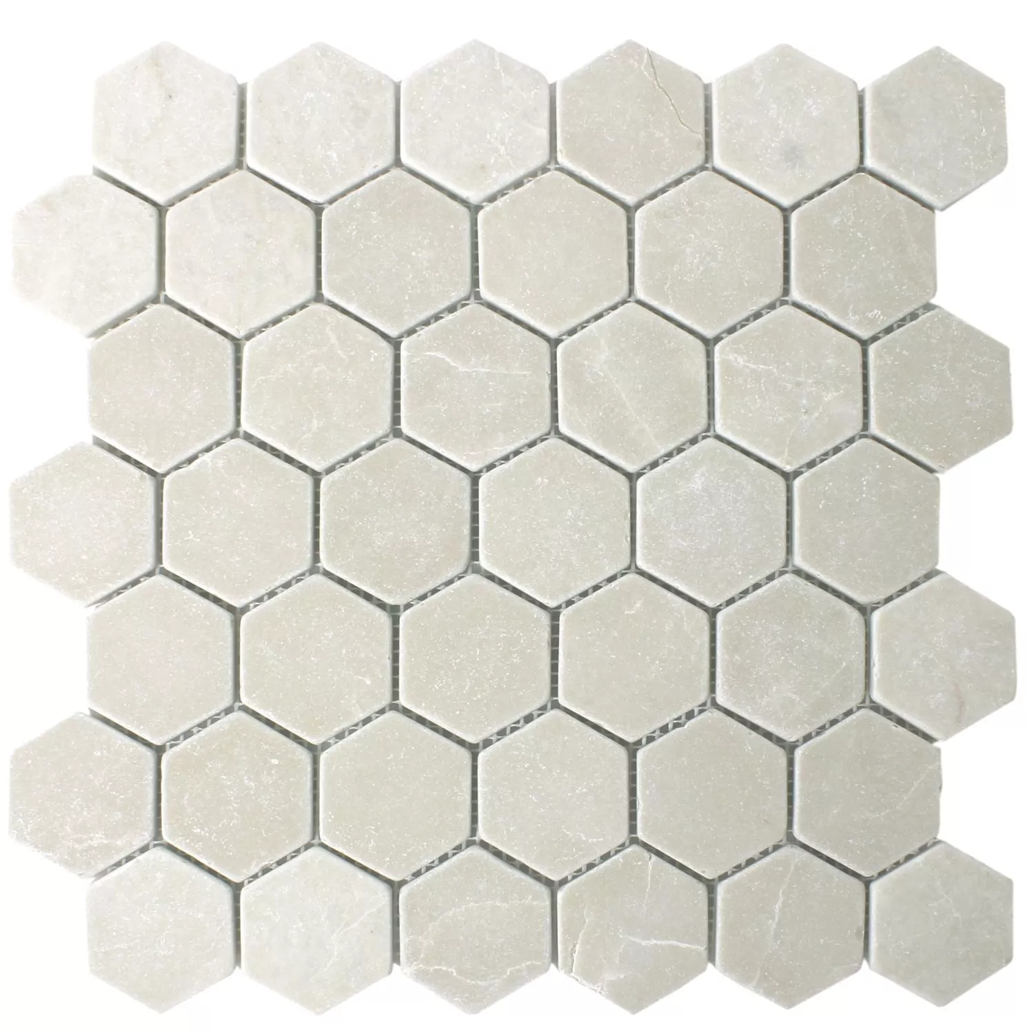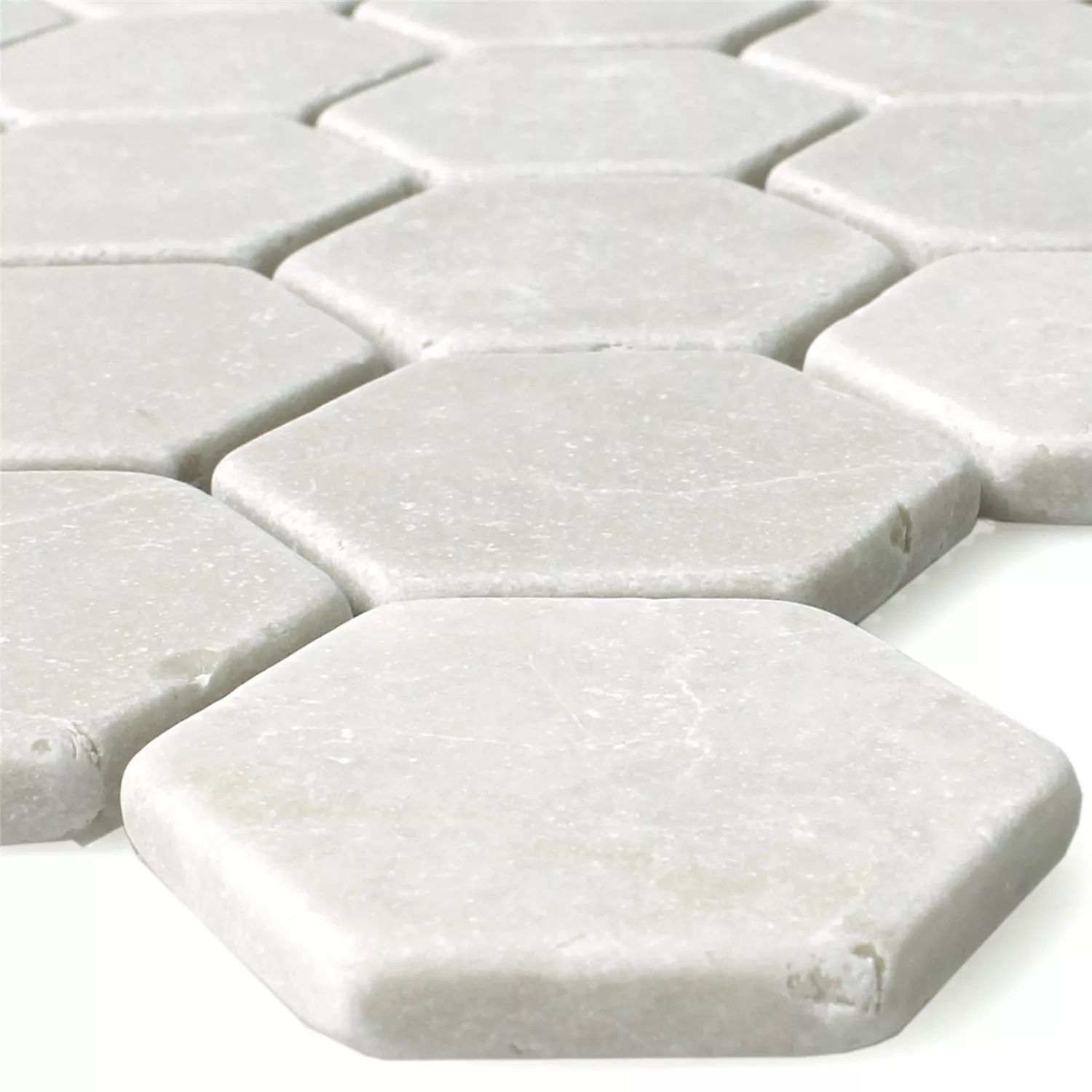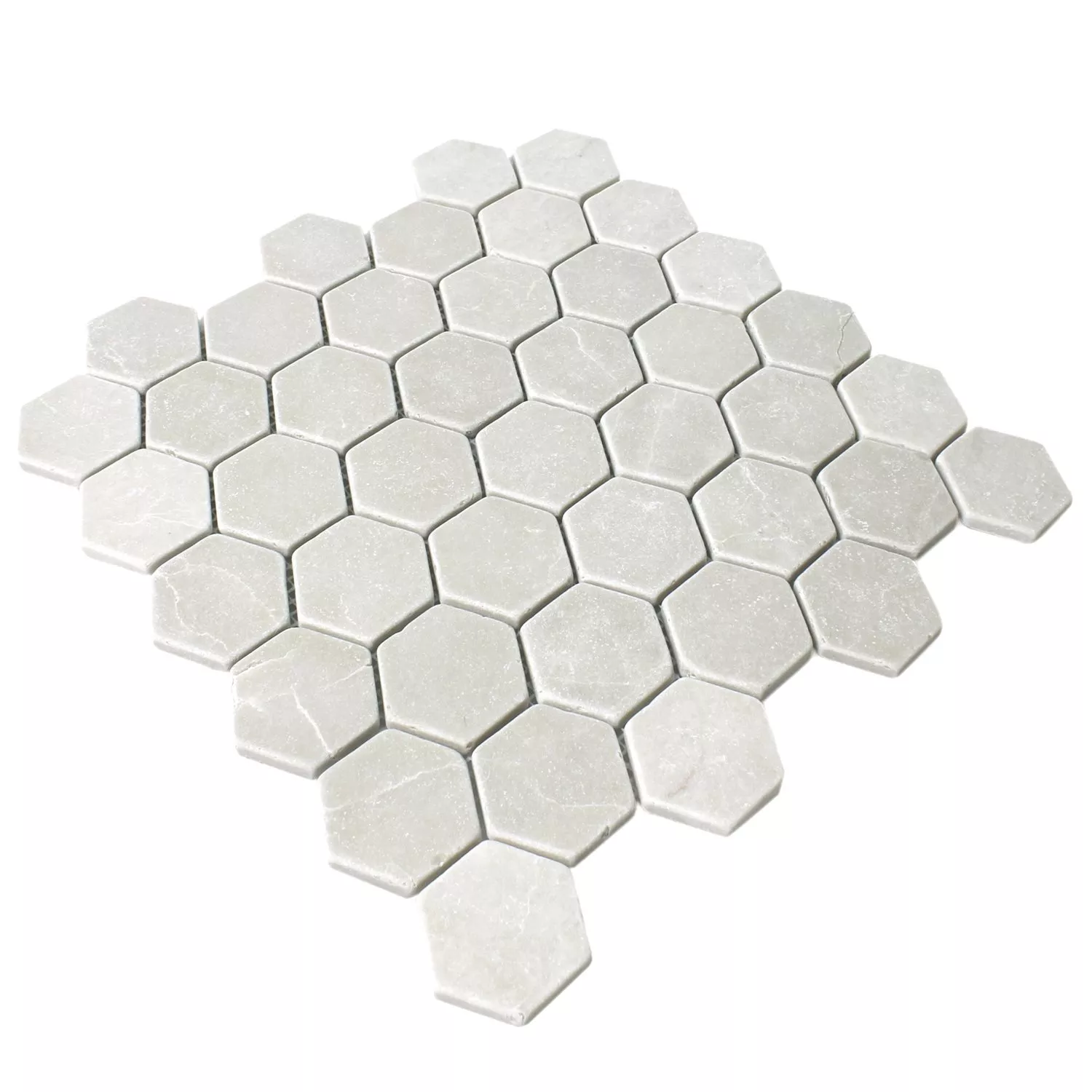 Мозайката на тази плочка от естествен камък Tarsus Beige се състои от мраморни камъни с шестоъгълна форма. Предлагат се в четири различни повърхностни шарки, които могат лесно да се комбинират помежду си. Това отваря възможности за дизайн, които придават на вашия апартамент много личен щрих.