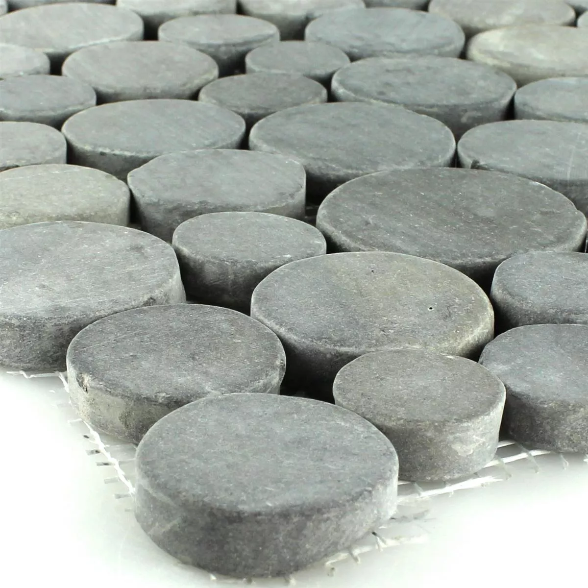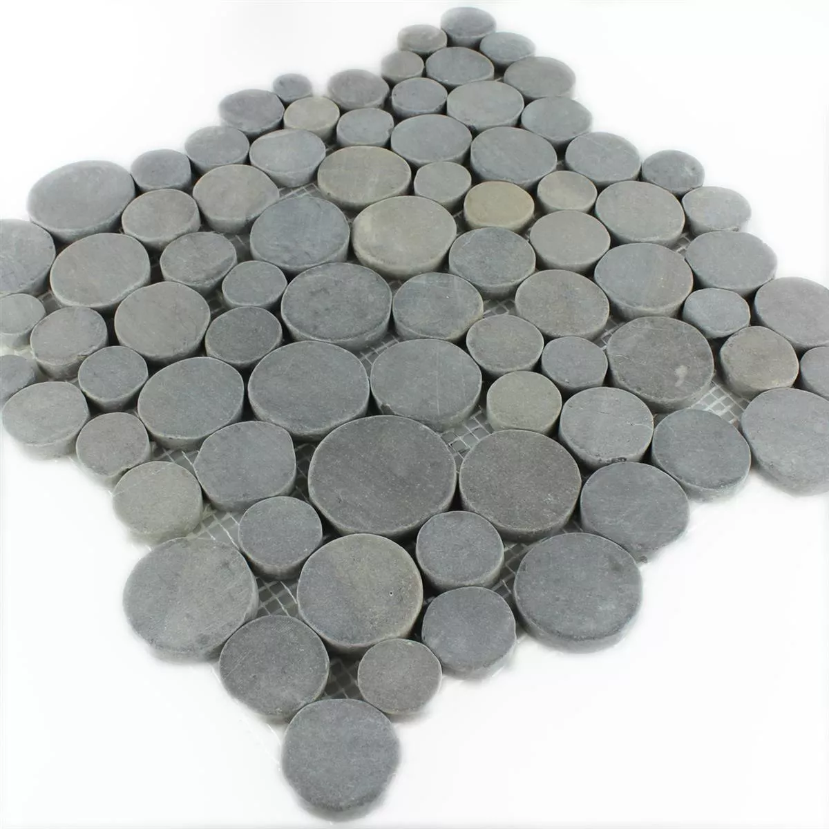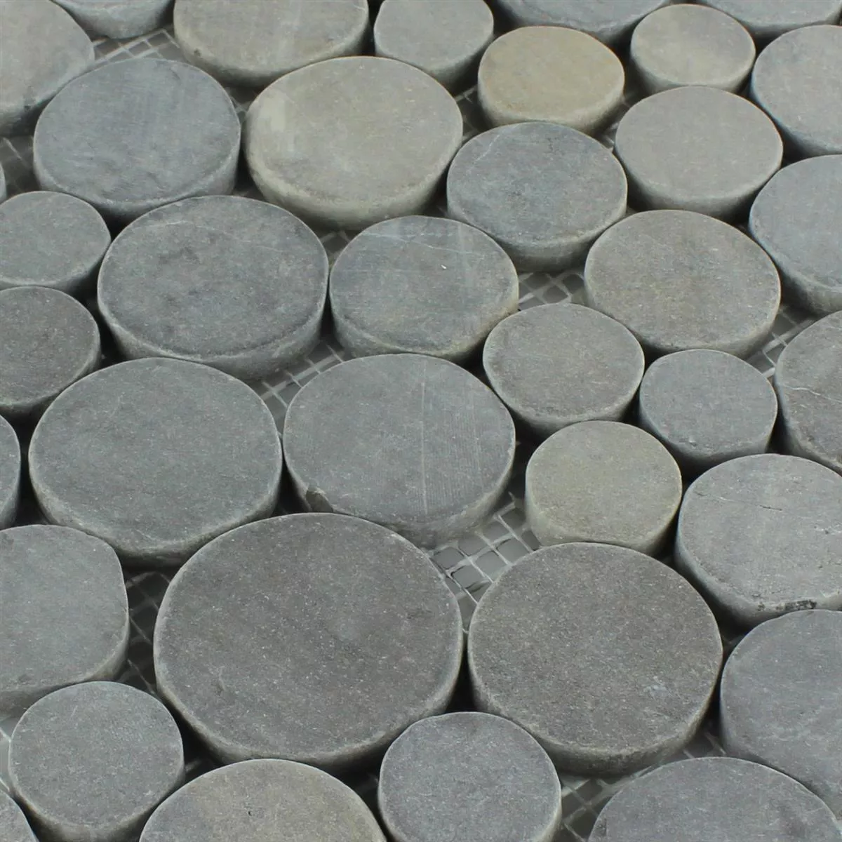 Естественият камък от речни камъчета в тъмно сиво не се произвежда промишлено, а се добива традиционно. Мозайката от естествен камък от речни камъчета може да бъде проектирана в цвят или комбинирана с други плочки от естествен камък, за да образува мозайка. Естественото оцветяване създава фин, висококачествен ефект. Мозайка от естествени речни камъчета може да се полага както на стени, така и на пода. Положен на пода, естественият материал осигурява успокояващ масаж на краката. Осигурена е и устойчивост на приплъзване. Те са с диаметър 9 милиметра.