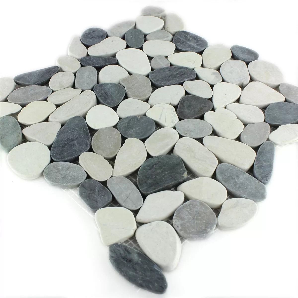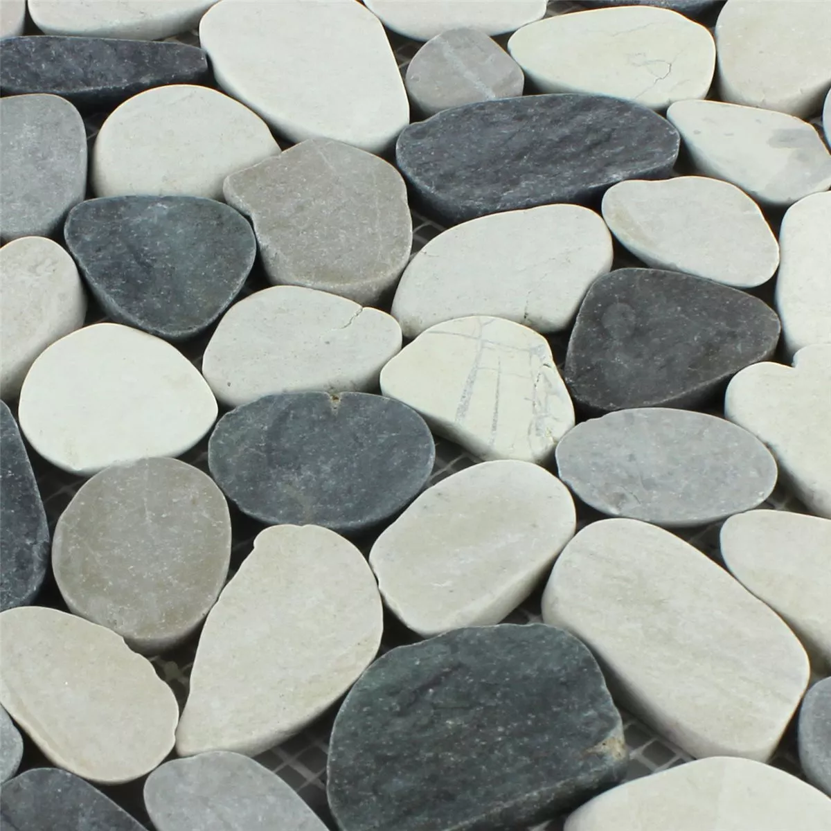 Sehr schöne Kieselmosaikfliesen, Farbton wie auf den Bildern dargestellt. Das Verlegen der Fliesen natürlich ein Geduldsspiel, sieht aber sehr schön aus. Da sie geschnitten (oder geschliffen?) sind, für den Boden bestens geeignet.