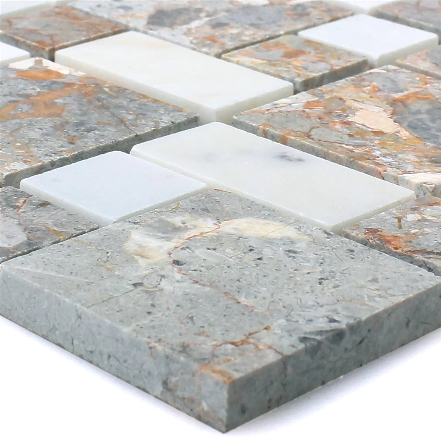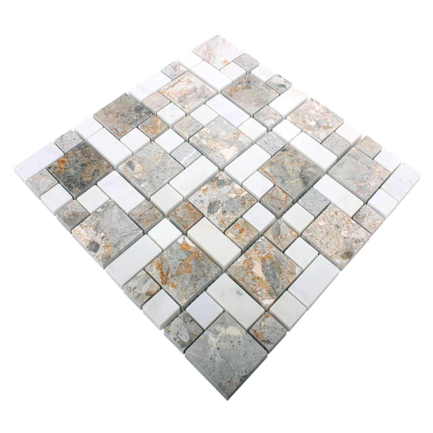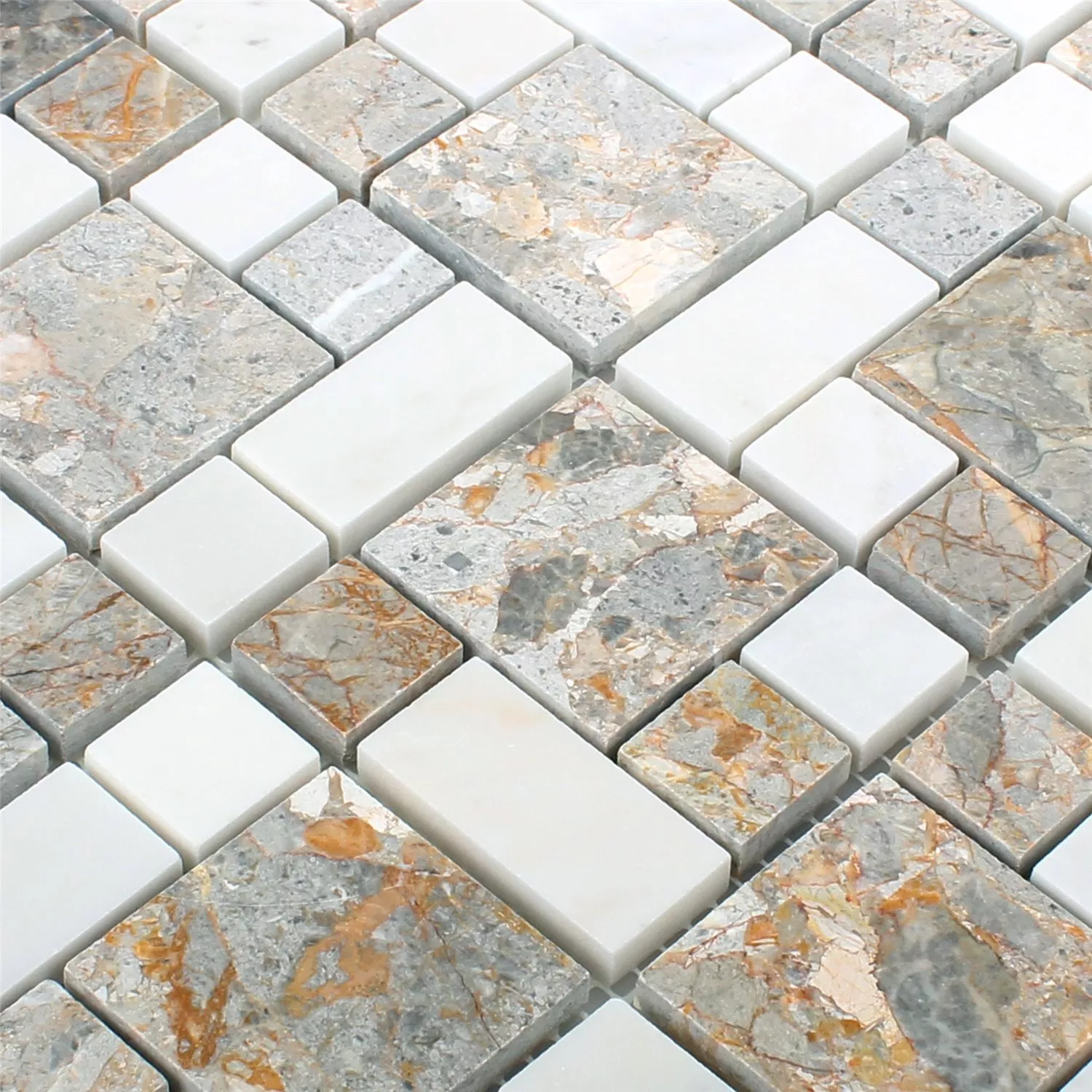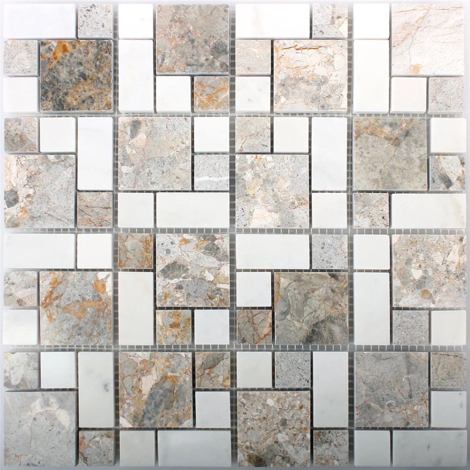 Камъните на тези мозаечни плочки в техния естествено елегантен външен вид създават впечатляваща визия в златно и бяло на повърхността. Това е елегантно и изглежда много елегантно в хола. Тези мозаечни плочки са много популярни и търсени, защото красят много жилищни помещения и допълват атмосферата. Мозайките на отделните мозаечни части са избрани в различни по големина формати, което създава още повече прекъсвания на визията, а цветовете са избрани в свободна шарка. Всяка подложка от тези мозаечни плочки е уникална и това води до индивидуални повърхности, които клиентът може да избере сам по-късно при монтажа. Естественият мрамор в камъка създава този ефект.