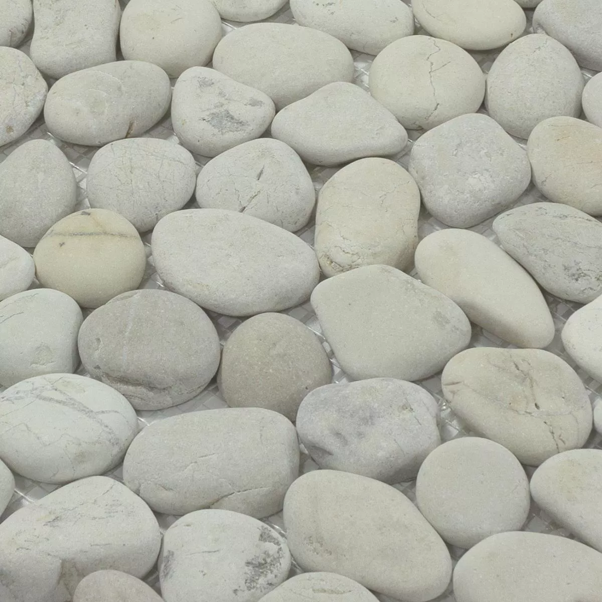 Мозаечните плочки Xanthos White pebble са особено красиви като покритие на стена или на пода. Малките плочки са изработени изцяло от естествен камък. Камъкът е изсечен и коригиран така, че всички камъни да са приблизително еднакви по размер. Завладяващата шикозна форма освежава всяка баня. Освен това се предлага и комбинация от двете. Това е може би най-красивият начин за използване на тези камъни. Мозаечните плочки се доставят напълно представени върху носещ слой. Това означава, че те могат лесно да бъдат положени на желаното място, дори и от обикновени хора. Камъните могат да се полагат както на пода, така и на стената. Във влажни помещения фугите определено трябва да бъдат затворени. Светлата смес за фуги е идеална тук като контраст. Това изглежда особено добре с черните плочки, но може да се използва и всеки друг цвят. Мозаечните плочки са лесни за поддръжка и могат да се третират с конвенционални почистващи продукти.