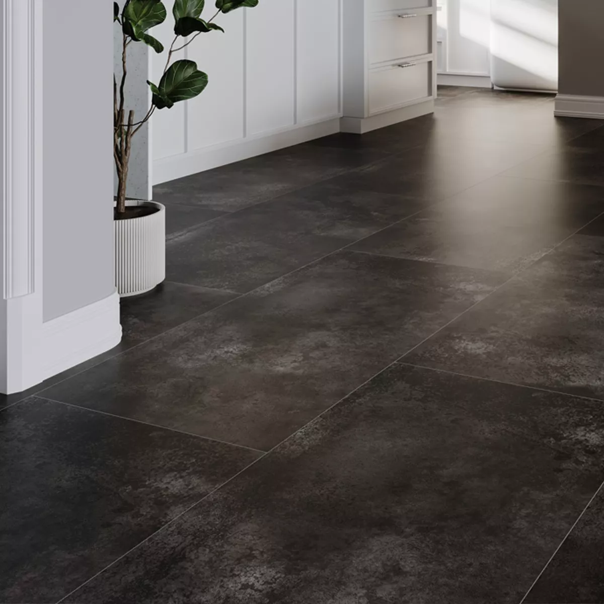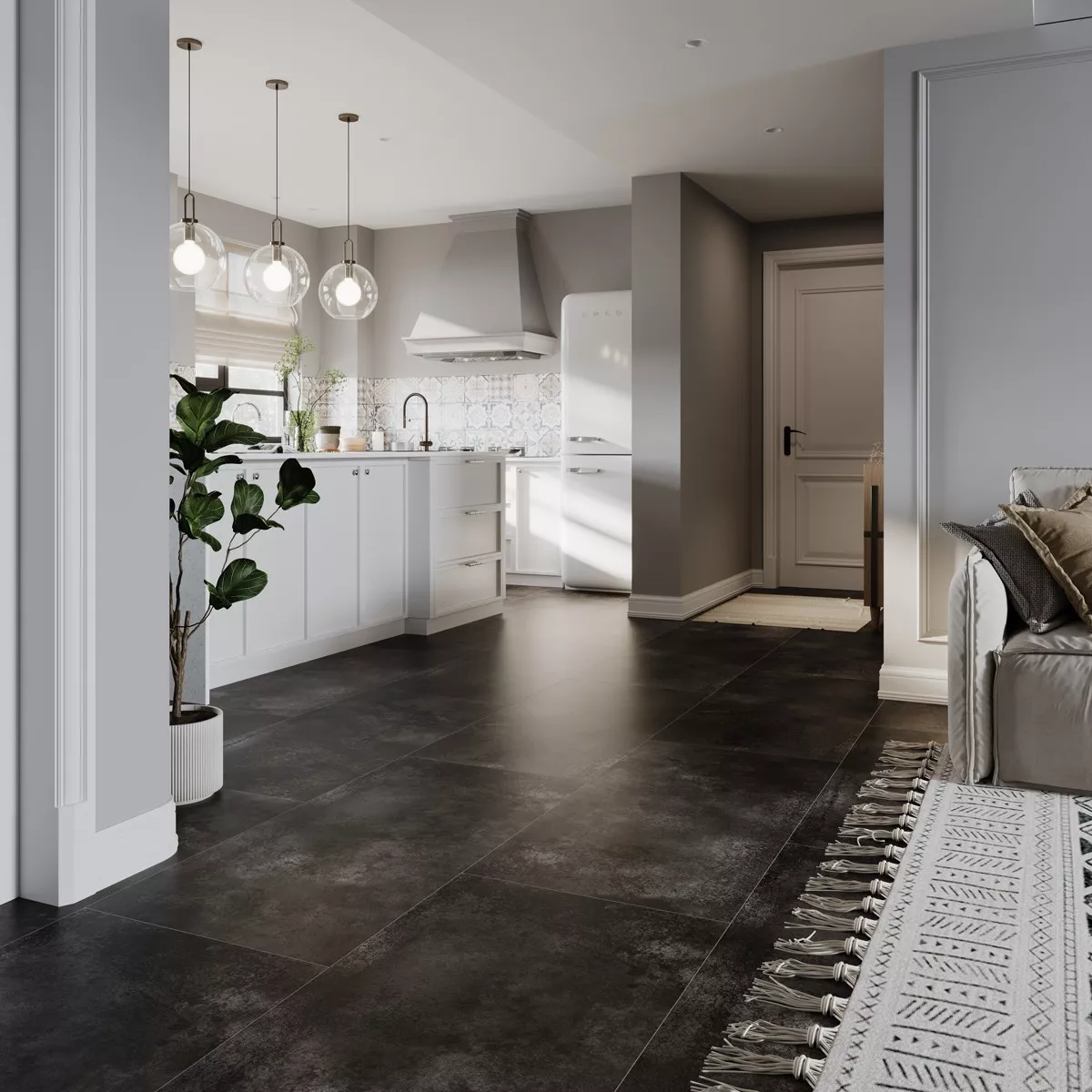Подовата плочка от гранитогрес Oregon в черно впечатлява с елегантния си метален вид и придава на всяка стая модерна, стилна атмосфера. Със своя щедър формат от 60 x 120 см, той осигурява елегантен, безпроблемен вид и е подходящ както за подови, така и за стенни облицовки. Матовата, остъклена повърхност подчертава вечния дизайн и прави плочката особено лесна за почистване.