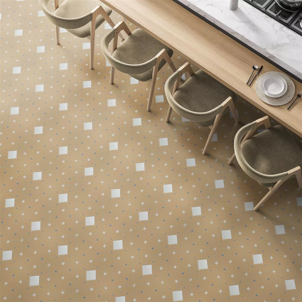 Ретро плочките с флорална визия са идеални за кухни, бани, душове и всекидневни. Събудете магията на отминалите времена с гранитогрес Retro Floral Look Beige Octagon 20x20cm.
