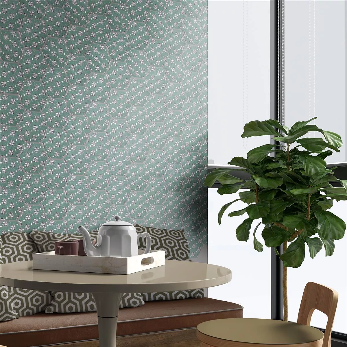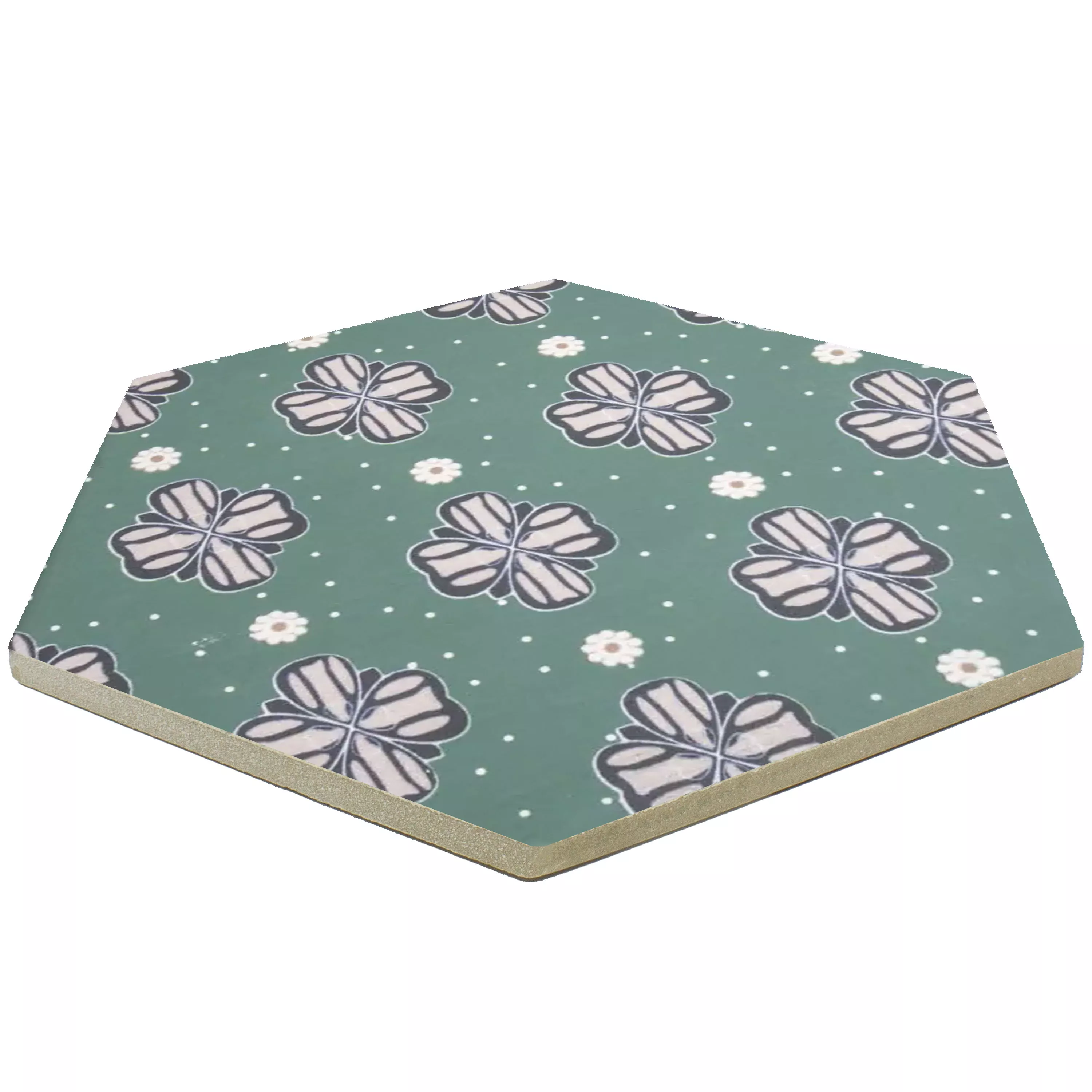Гранитогресът “Modena Hexagon Decor 7” съчетава впечатляващ дизайн с висока функционалност. С дебелина от 10 мм, те са идеални за мокри помещения, душове, бани, кухни, всекидневни и закрити помещения. Матовата повърхност, в атрактивно зелено с флорални орнаменти, придава на плочките вечен елегантен вид.