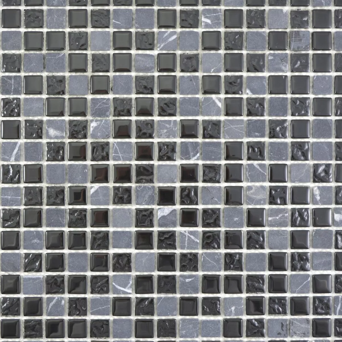 Стъклените мозаечни плочки от естествен камък Зекова в цветова гама черно сиво са изработени от редуване на мрамор и стъкло. Стъклената мозайка от естествен камък Зекова е с размер на камъка 15 х 15 мм. Освен това камъните имат последователно матова и лъскава повърхност.